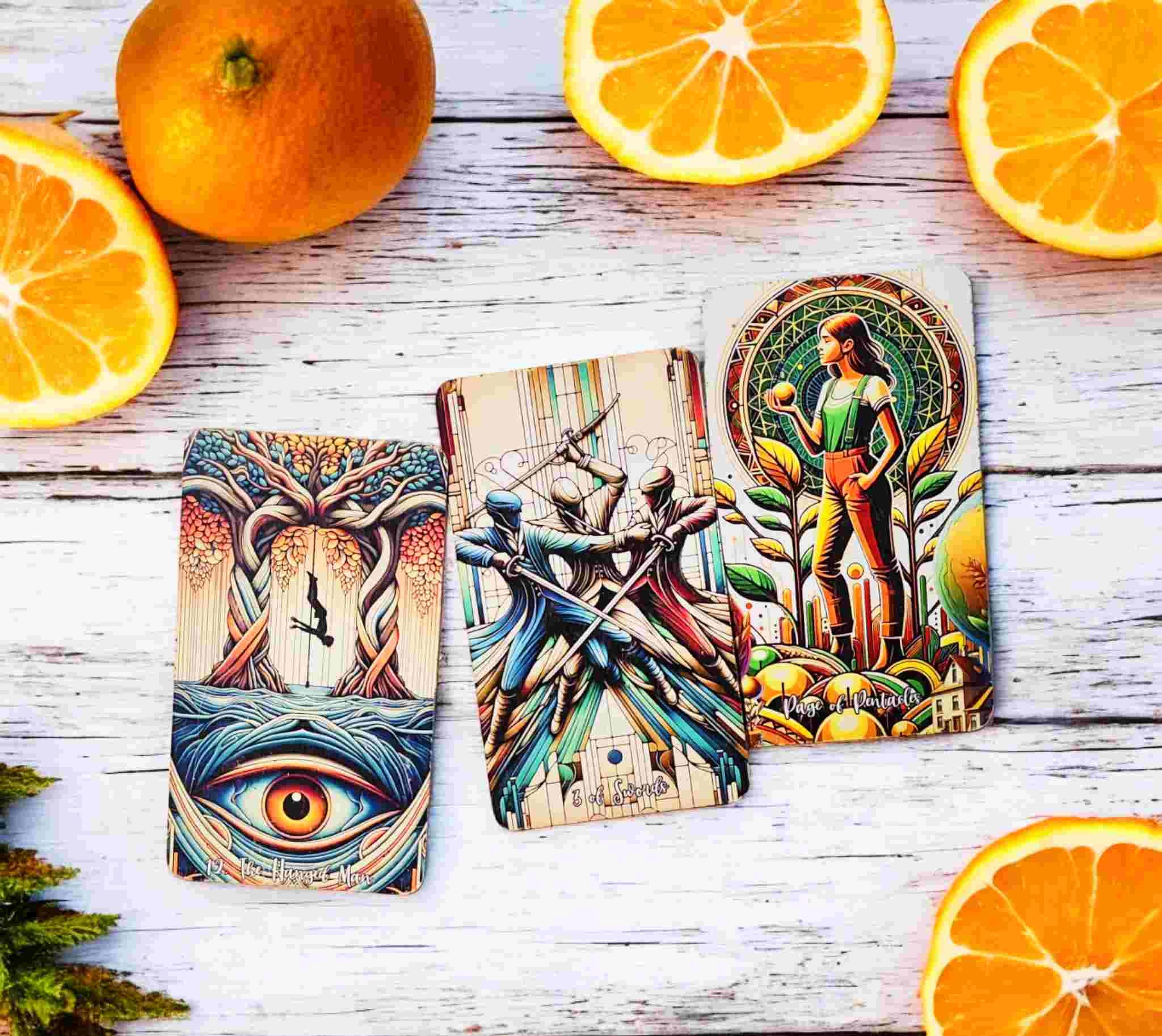 Picture this: The Hanged Man (looking suspiciously like all of us during Mercury retrograde), Three of Swords (basically the "it's not you, it's your past seven incarnations" card), and the Page of Pentacles (serving big "went through hell, started a spiritual farm" energy). Together, they're basically the universe's version of a PowerPoint presentation about your soul's journey, just with better special effects and zero clipart.