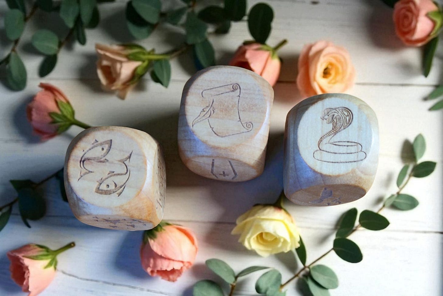 The dice tumble across the table like tiny cosmic messengers and land on Fish, Book, Snake.